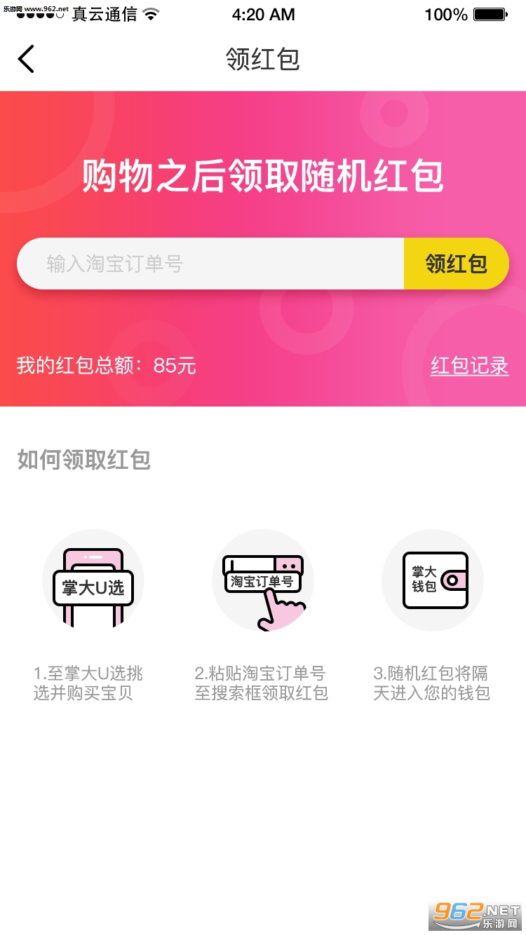 支持购物后通过淘宝订单号在U选领取现金红包,24小时内必到账!