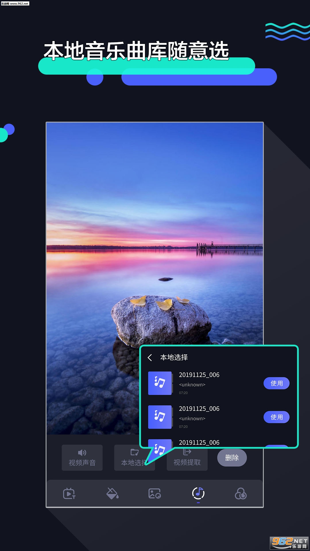 「背景音乐」关闭视频原声,支持添加多段音乐到视频作为背景音乐,让你的作品表现力无与伦比。