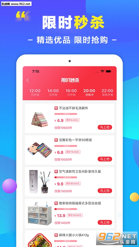 三场秒杀。每天8点、14点、20点千余款特价商品供你挑选,搜罗全网超低价优惠券商品,时时上新的爆品大本营。