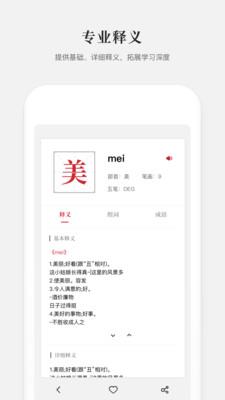 *查询结果的组词、成语、近义词、反义词可以直接点击进行查询,实现深度化查询,帮助更深刻的理解。