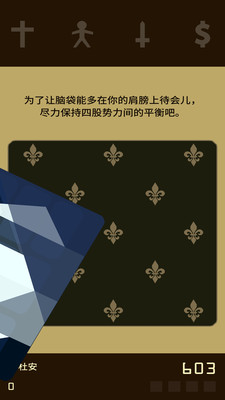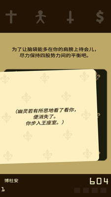 飘忽不定的王国命运:每年发生的随机事件会根据你的选择对宗教,民生,军事和财政四个方面造成影响。谨小慎微的决策和富有远见的规划是统治长青的奥秘所在,然而,难以预料的突然事件或者可怜的霉运都可能轻易动摇你看似牢不可破的权力。"