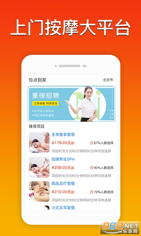 《你点到家app》给用户们提供了一款上门按摩服务平台,你点到家app帮助大家在这里可以手机精选技师,来提供一款优质的上门按摩服务,让各位用户们可以通过你点到家app开启优质的按摩养生服务,优质技师给你带来身体健康喔~