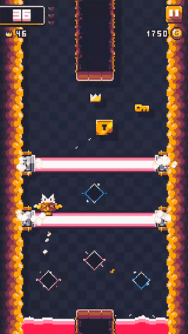 喵喵冲撞中文版是一款像素风格的竖版休闲益智类游戏,游戏中玩家要不断的控制小猫上升躲避机关和陷阱,收集王冠来补充能量,获得更多的金币强化自己,这里有上百个关卡可供玩家挑战,趣味十足。
