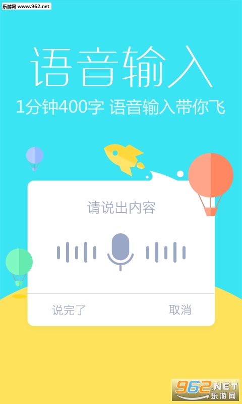 1分钟400字,语音输入带你飞;支持19种方言输入,能够听懂你的家乡话;支持离线语音,没有流量也能语音输入;支持随声译,说中文出英文,不会英语也能与老外轻松交流!