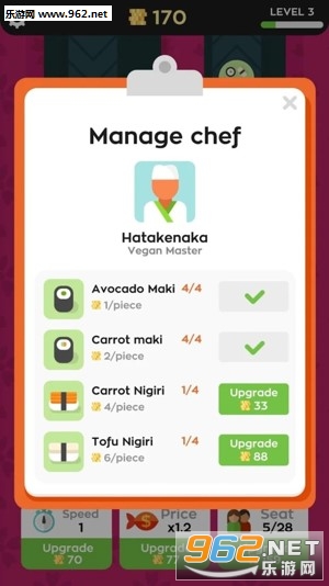 《寿司连锁店》是一款十分有趣的放置类手游,尝试开一家新的寿司店,为前来光顾的客人们提供各种美味的寿司。客人会源源不断地进来,你必须忙活不停,时刻保持传送带上放有足够的料理。喜欢的小伙伴们赶紧来下载吧!