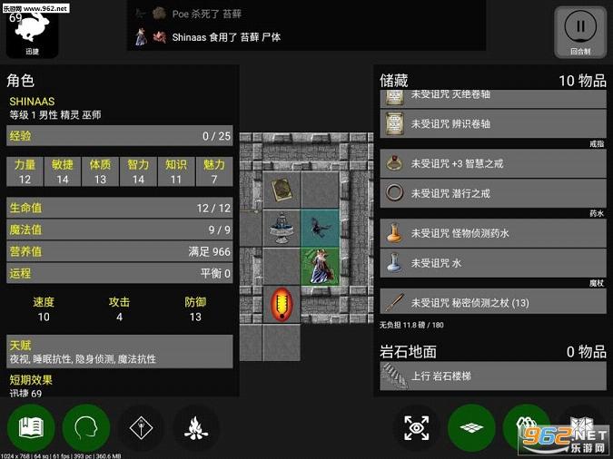 角色的每一次移动都会消耗体力,因此在个人信息的窗口中需要时刻关注饥饿度保持自己的健康。在地牢中通过战胜怪物可以获得怪物的尸体,进而食用来保持饥饿度。游戏没有结局,直到玩家被怪物杀死或是放弃此次冒险才视为此次游戏结束,开启下一次游戏。