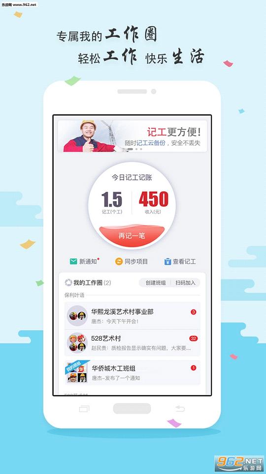 工人班组app主要致力于通过移动互联网帮建筑工友更诚信、快速、便捷的“找活招工”“记工记账”,新增设的“工作圈”版块,更为工友搭建了一个及时沟通的工作圈子。