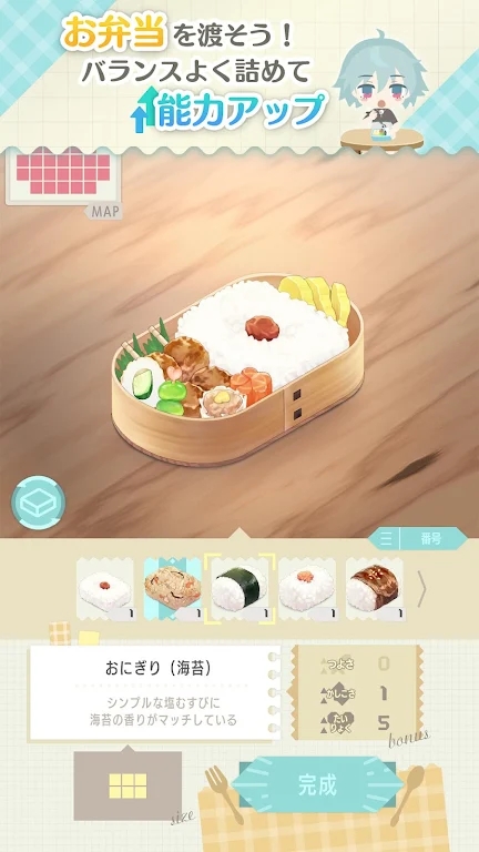 游戏性内容比较欠缺,暂时看到的只有制作便当=方格排列+配点养成(游戏时间与现实时间相应体力恢复时间似乎固定)