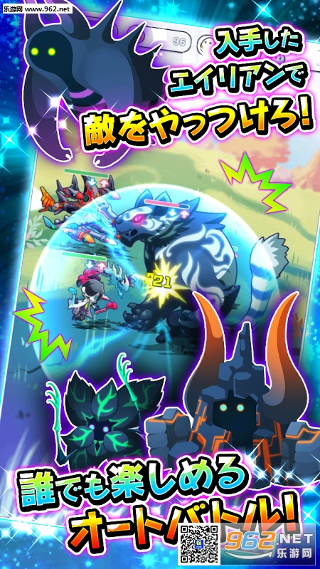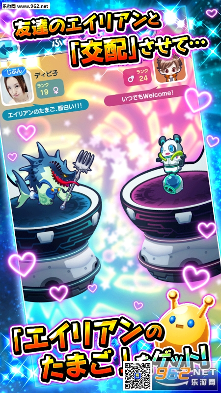 诞生并培育这些新外星人的“交配RPG”。和好友一起摇一摇手机,就能让自己的外星人和好友的进行交配,生出来的外星人会变得更强,而且还会突然变异!?如果是自己一个人玩的话,可以选择游戏内来玩的外星人进行交配。