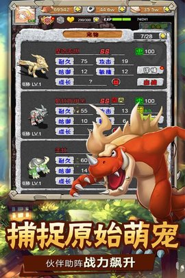 4.遥远又深刻的记忆超级复古的画风:画风完美重现记忆中的《石器时代》,回忆青少年美好时光并留下青春记忆的经典作品,浓郁原始的游戏风格、开放可探索的远古世界、经典的策略回合战斗以及可供骑乘驱使的史前猛兽……数量庞大的史前猛兽疯狂奔袭!穿上兽皮,握起石斧,我们坚信,定能对抗那最可怕的敌人。