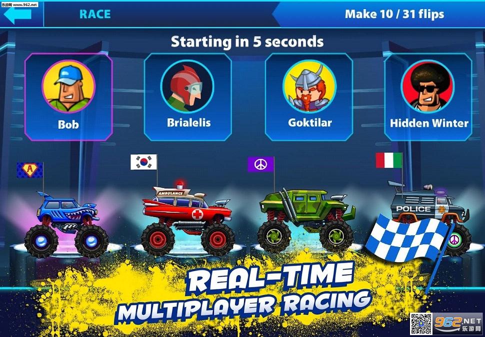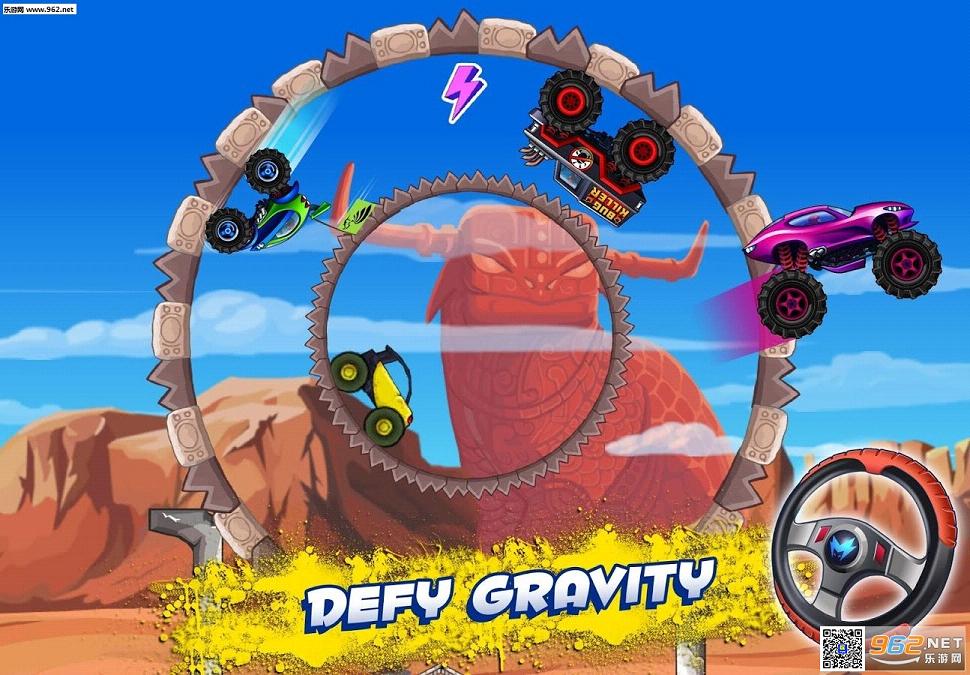 来场惊心动魄的赛车吧,穿越沙漠或北极圈。克服地心引力的作用,把对手远远甩到后面去!磨烧轮胎、跃过山丘并极速穿过疯狂的竖环赛道,收集硝基以提升燃料效能!使用金币可对车辆进行疯狂改造,从而确保你能统治赛道。