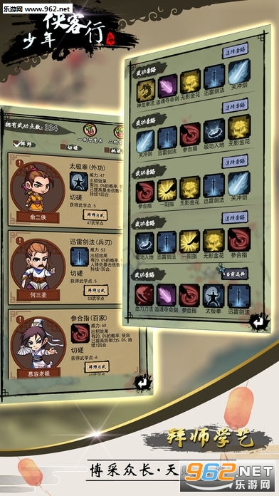 2.武功套路是游戏最内核的玩法;游戏设置108门武功,可以拜师学习。