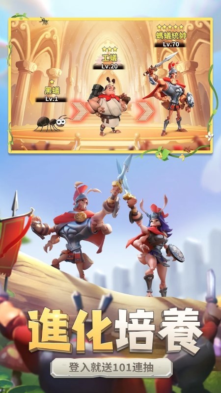 弱肉强食的世界,团结才是通往胜利的法则,首日进驻蚁族奇兵的联盟,将可参与挑战「蚁王之战」赛事,历时两个星期,多个联盟跨服角逐,赛事第一名联盟可获百万台币奖金。