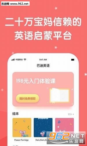 巴迪英语app专注0~6岁少儿英语启蒙,巴迪英语app根据语言“习得法”研发了“语感培养-自信表达-自主阅读”3年课程体系:第1年让孩子爱上说英语,第2年和老外轻松交流,第3年轻松阅读各种分级章节书。每天仅需10分钟,3年掌握听说读。课程7天1个学习周期,1年40周教学,共280节课,通过儿歌、动画、绘本、游戏等趣味性、多元化的方式进行亲子互动教学!