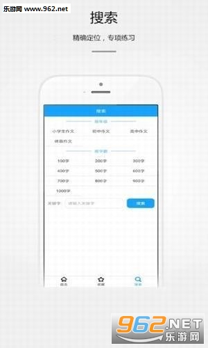 【查找】可按年级、体裁、话题分类、字数等要求来查找作文,也可以多个关键字搜索作文;