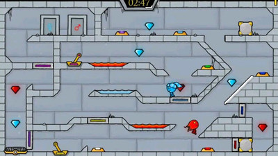 人物控制方面,游戏仅仅设计了三个操作,左右移动和跳跃。每一关中我们都需要利用红蓝两个角色切换使用,合理的利用机关来过关。游戏中有一个分数的设计,分数并非简单的过关结果,同时也是计时器。每当我们控制的角色在场景中收集到与自己相应颜色的钻石之时,分数就会增加,如果耗时过久没有过关,分数则会慢慢减少。因此分数越多,代表着你过关越快。