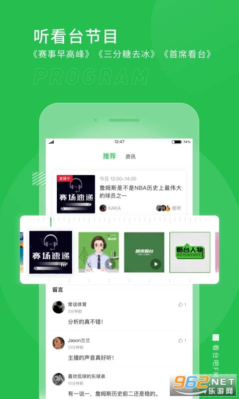 【听看台节目】:‘赛事早高峰’为您深度盘点昨夜今晨体坛大事;‘三分糖去冰’休闲一刻,陪您度过午后闲暇时光;体育圈热门话题,重磅体坛嘉宾,尽在傍晚‘首席看台’。