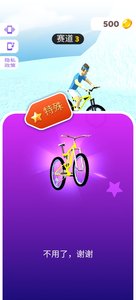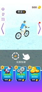 用户可以通过通关后的奖励金币打造自己专属的自行车,可以对自行车的速度、方向盘、通关奖励多个方面进行个性化升级,也可以通过一次次关卡奖励获得心意的自行车。
