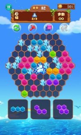 六边形世界手机版是一款益智休闲类型游戏,玩家需要在一个六边形的框内,从屏幕下方选择方块拖入到六边形框内,任意一方向填满一条连线即可消除所在行或者列,一旦下方出现的方块无法放入框内,则游戏结束。