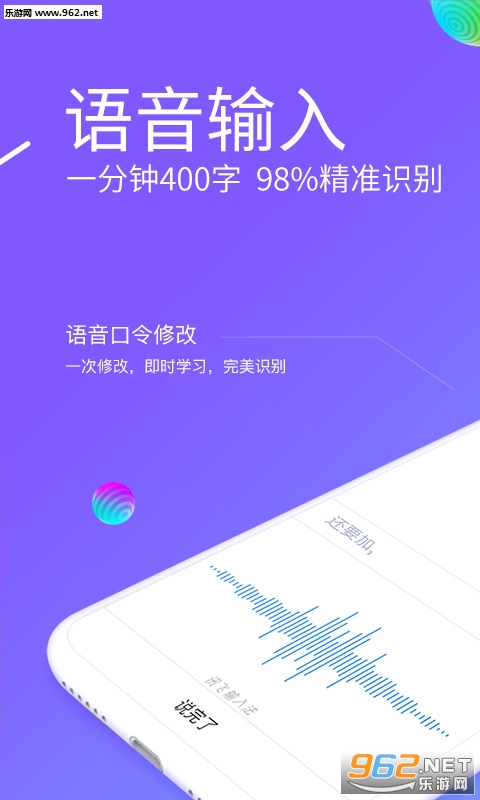 讯飞输入法智能语音输入,识别准确率98%。1分钟400字,语音输入带你飞;支持耳语输入,轻声说话也能精准识别;支持22种方言输入,能够听懂你的家乡话;支持随声译,说中文出外文;支持语音斗图,说话秒发表情;语音智适应,知你所想懂你所说,语音修改一次就好!