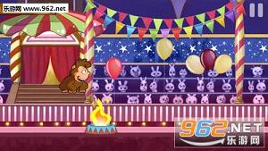 简单的随机游戏画面、红白机游戏中经常出现的马戏团火圈和冒险岛石头及火盆、由玩家控制一只傻乎乎萌呆呆的金刚大猴子不顾一切的往前跳。你只需要不断控制点击屏幕来调节金刚的跳跃时间和跳跃点,让金刚一直顺利地往前冲,你就可以得到相应的过关分值。如果你不小心碰到了火盆或者撞上了石头,游戏便宣告结束了,一切都只能从头来了。