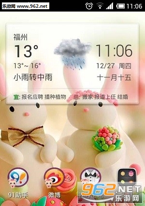 百年好合app是由个人大神制作的一款主题美化软件,它拥有十分可爱的外观,桌面上有两只相亲相爱的萌萌的兔子,背景还有充满了粉红色,意味着长长久久,拿来做情侣主题再好不过了,并且该主题桌面使用简单,所有的插件和功能都能使用,可以完美替代系统自带的桌面。除此之外,该应用拥有许多小部件,如一键清理、百度搜索、快捷开关、模拟时钟,每一个插件都能单独拖至桌面上使用。
