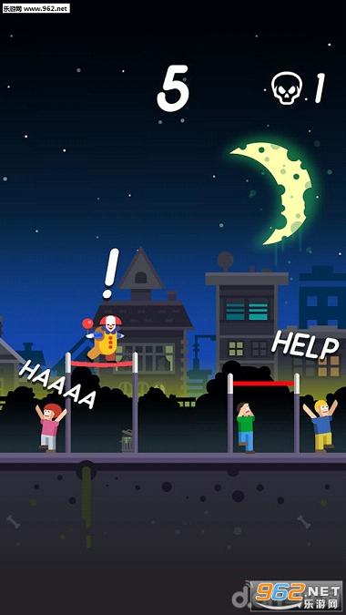 在游戏中,你将化身一位喜欢捣蛋的小丑,在深夜时跑到街上去吓唬胆小的路人,不过不是使用激进的方式,你的捣乱方式也富有戏剧性。在路边会架设许多独木绳,你需要控制小丑在这些独木绳之间跳跃,利用绳子的弹性可以跳跃到空中做出高难度动作,你的这些举动在路人看来就十分恐怖、造成不小的心理压力,于是会大喊“救命”或是因此笑哭在地……