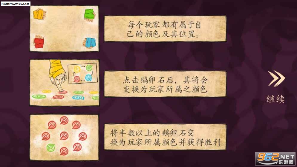游戏规则也非常简单,依照关卡的不同,只要将一定数量的鹅卵石转变为自己所属的颜色即可获胜。也许从规则叙述中看不太出来,不过可以稍微想像一下四个人挤在一台平板电脑前努力的连点萤幕,呈现出你挡我、我戳你的有趣画面。