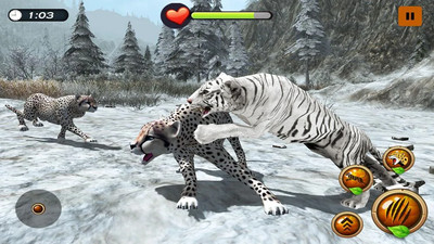 模拟老虎野外捕食的游戏,游戏中你将模拟一只老虎在野外生存,其实现实生活中根本就没有北极虎这个品种,主要是东北虎和孟加拉虎,北极熊和北极虎北极狼这些都是存在的,但是现在我们不用纠结这些,现在外面的世界都被冰雪覆盖,外出猎食对你们来说难度还是很大的,但是为了生存你们没有别的办法。