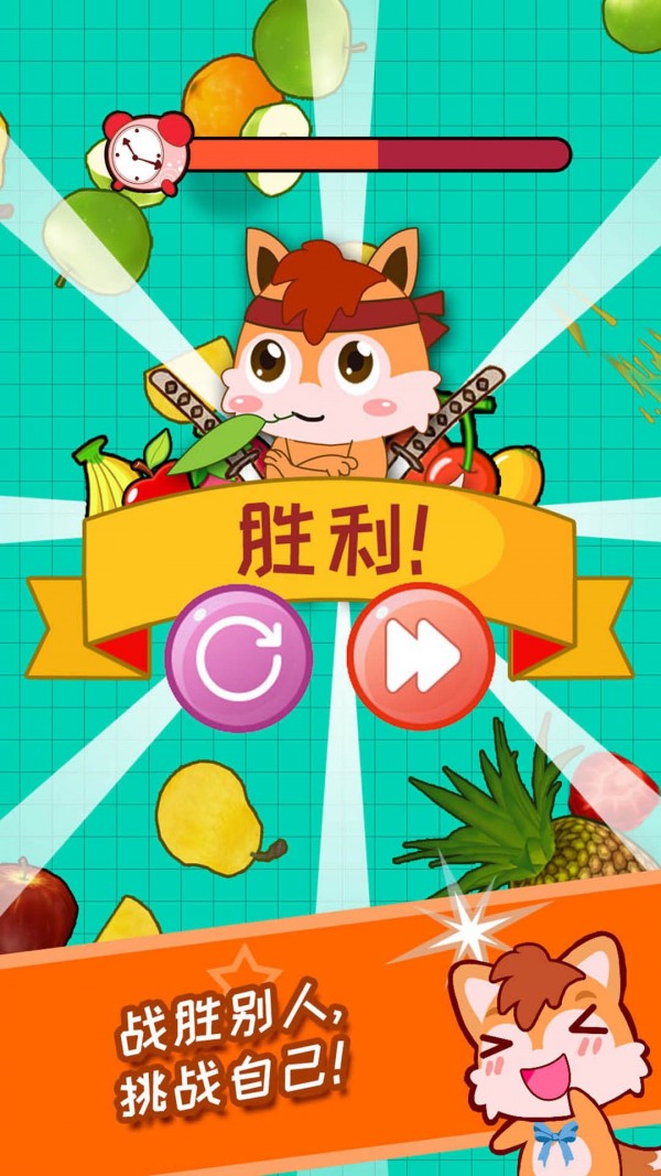 1、滑动手指,将可爱的水果切成两半,炸弹扣分,闹钟加时;