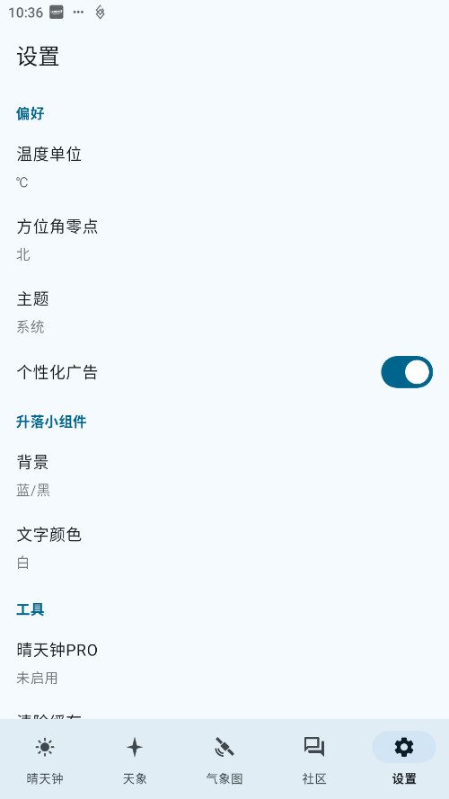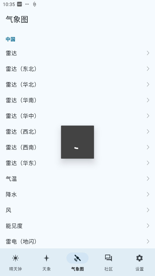 第一次打开软件时,系统会要求选择所在地,选择后可以看到包括“晴天钟”、“天象”、“云图”和“圈子”在内的四个主要选项。
