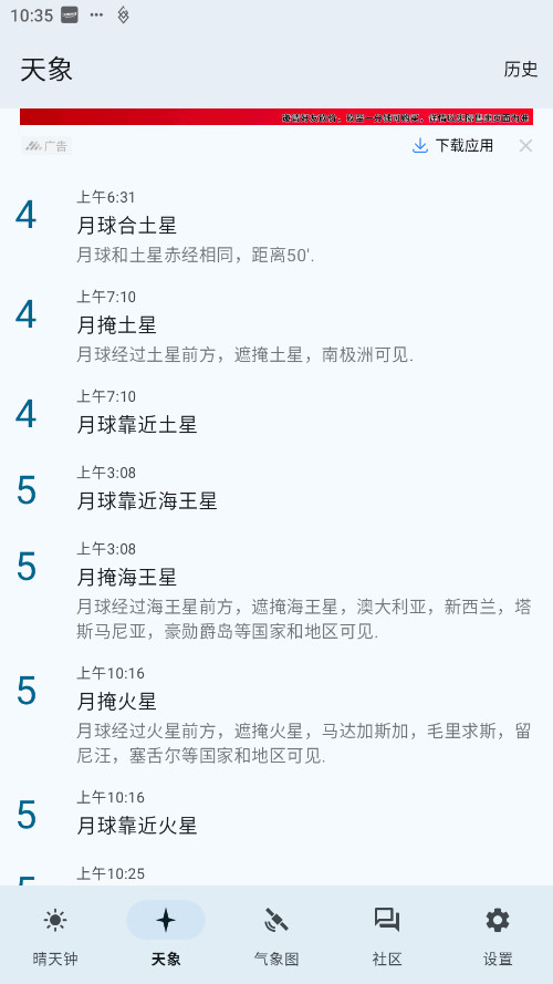 《晴天钟app》是一款非常专业的天文预测观察软件,通过收集各个专业数据网站的消息了解各种各样的数据,太阳是几点升起落下,各种各样的星球运转,以及各种天文观测数据,如果你对这些感兴趣可以下载试试。