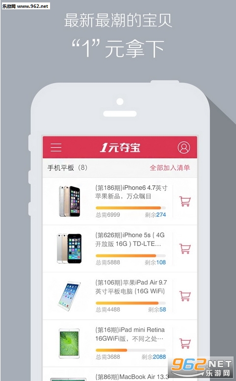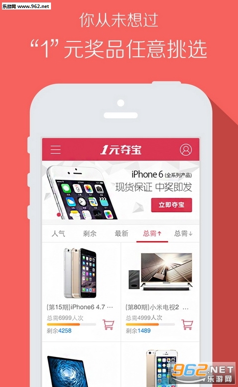 阿里1元夺宝手机版app是一款款网络购物软件,阿里1元夺宝,上百种潮流商品等着你,只需1元。阿里1元夺宝,1元抢购苹果6S,今日注册就送2元夺宝币红包。实现愿望,只需1元上百种潮流商品等着你,统统只需1元。