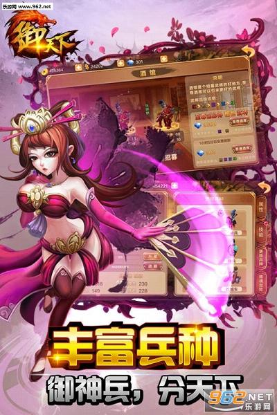 《御天下》是一款以三国为背景,结合神话传说,为您创造出一个三国征战与神话力量共存的神奇大陆。 《御天下》中您将扮演一名胸怀宏图的王者,收集108名武将一起踏上征战天下的冒险之旅。游戏以攻占城池为主线,搭配各类副本关卡,加上游戏中融合了多种玩法,包括武将养成,策略配兵,塔防建设,主城建设,9人实时组队游戏共同讨伐BOSS等。