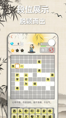 在这里玩家将挑战各种有趣的关卡,探寻中华博大精深的成语文化,在寓教于乐的氛围中学习知识,借鉴了传统成语接龙的玩法,使得毫不相干的一些成语连成一组题目,你需要填满这些串联在一起的成语,同时还结合了古代加官晋爵的体系,让用户在学成语,提升知识的同时体验一番金榜题名功成名就的感觉。