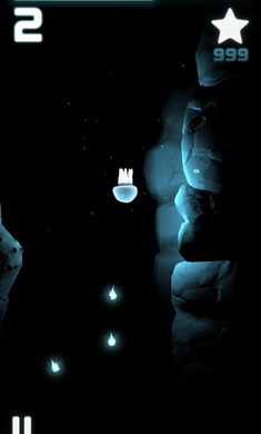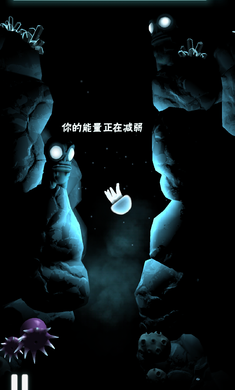 游戏的操作很简单,只要在屏幕上任意划动一下就可以让水母朝着对应方向游出一小段距离,为了游得更远,我们必须不断划动。可以看到在画面上方有一个能量槽,能量会随着时间不断流逝,一旦耗光那么就等于宣告旅程结束,前期由于对操作不太熟悉,还没折腾几下就 GAME OVER 了。