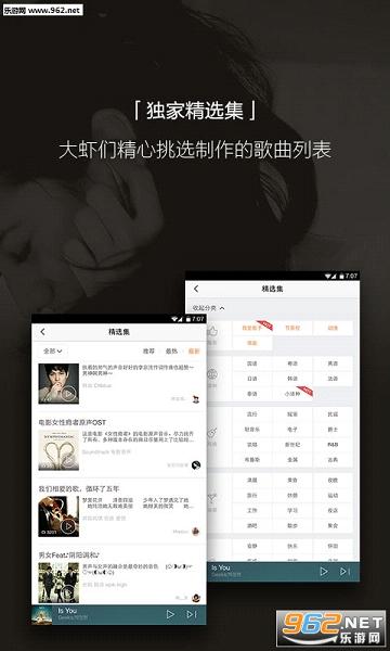 通过丰富多样的排行榜、Am精选集、音乐电台直接收听音乐,更可搜索虾米经过严格审核的百万高品质曲库(音源能保证192kbps~320kpbs的比特率)