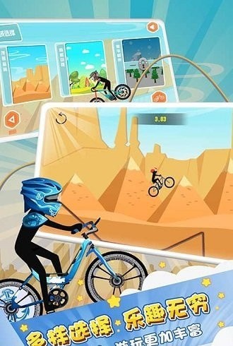 火柴人单车带你重拾单车上的时光,游戏中玩家化身为一个单车少年,随着柔和的音乐,脚踏单车穿越丛林、荒漠、冰原,似乎有一阵暖洋洋的威风佛过脸颊。按住屏幕右侧加速前进,按住屏幕左侧刹车,游戏有轻微的重力感应,顺利抵达终点即为通关,通关用时得到相应的星级,完成一个关卡可打开下一关卡。快来试试吧,看你能闯过多少关?