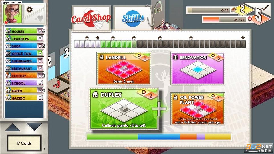 了解了游戏中关于建筑的设定,我们再来讲讲它的玩法,在一局游戏开始时,我们需要从屏幕左侧的卡组当中循环进行卡片的抽取,并将抽取的建筑物放置在地图的格子之上,当摆下第一块建筑群时,玩家就必须考虑到之后建筑群的走向,否则等到空位越来越少时就很难下手了。一般来说建筑群都由十字路口来分隔开来,不过在居民房屋集中的地带,十字路口就不能设置过多。在发展城市经济的同时,居民区的绿化和减噪工作也需十分重视,否则就有可能成为空城。