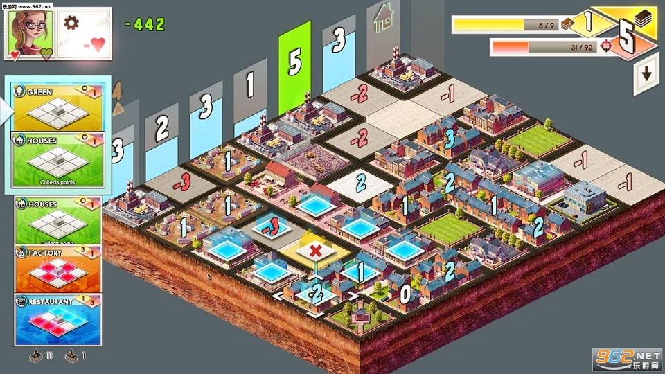 了解了游戏中关于建筑的设定,我们再来讲讲它的玩法,在一局游戏开始时,我们需要从屏幕左侧的卡组当中循环进行卡片的抽取,并将抽取的建筑物放置在地图的格子之上,当摆下第一块建筑群时,玩家就必须考虑到之后建筑群的走向,否则等到空位越来越少时就很难下手了。一般来说建筑群都由十字路口来分隔开来,不过在居民房屋集中的地带,十字路口就不能设置过多。在发展城市经济的同时,居民区的绿化和减噪工作也需十分重视,否则就有可能成为空城。