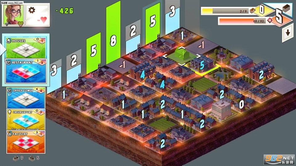 了解了游戏中关于建筑的设定,我们再来讲讲它的玩法,在一局游戏开始时,我们需要从屏幕左侧的卡组当中循环进行卡片的抽取,并将抽取的建筑物放置在地图的格子之上,当摆下第一块建筑群时,玩家就必须考虑到之后建筑群的走向,否则等到空位越来越少时就很难下手了。一般来说建筑群都由十字路口来分隔开来,不过在居民房屋集中的地带,十字路口就不能设置过多。在发展城市经济的同时,居民区的绿化和减噪工作也需十分重视,否则就有可能成为空城。