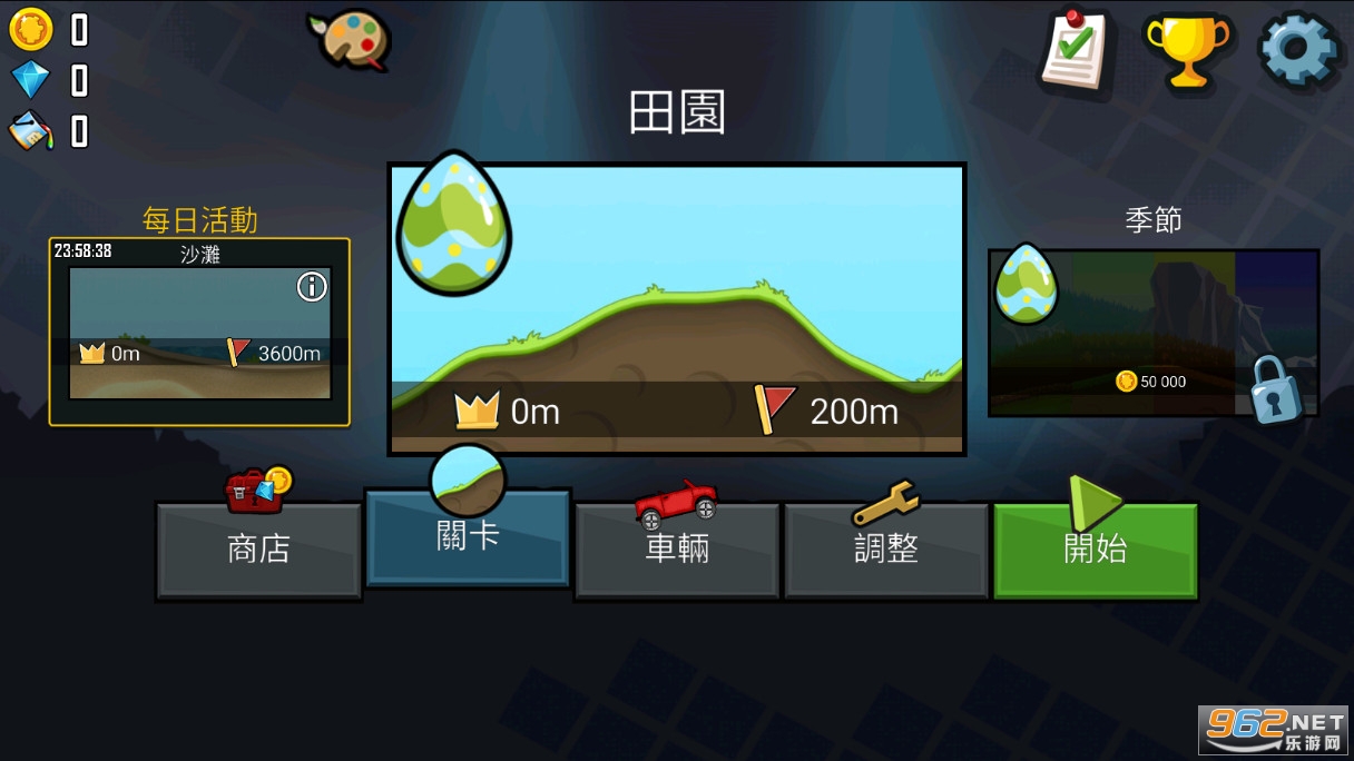 游戏会记录玩家每个关卡到达的等级和最大距离,用获得的奖金可以在在车辆选项里面换新车