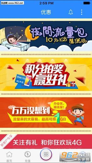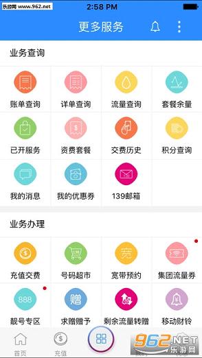 首先,进入首页,你将会看到基本上所有的功能都是集合在首页的。详单查询、套餐余量、资费套餐、宽带预约、充值中心、账单查询、积分兑换……
