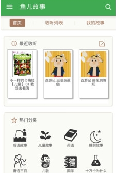 1到6岁宝宝听故事,一切为了宝宝。鱼儿故事里面有很多很多爸爸妈妈为宝宝讲的故事,爸爸妈妈也可以把自己制作的故事分享到鱼儿园地里面来,宝宝就可以听到你们的故事了。里面含有很多 童话 、成语、寓言、国学、英语类故事,一千零一夜、三字经、伊索寓言、十万个为什么、唐诗三百、安徒生童话、成语、格林童话、海的女儿。还有神奇校车、学会管自己、写给儿童的中国历史、这就是二十四节气、吴姐姐讲历史故事、情商培养等经典书屋的有声故事