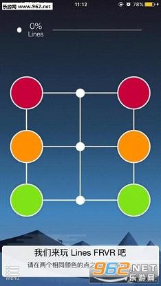 《Lines FRVR》是一款极简风格的解谜闯关小游戏,滑动线条,形成路线,回路等等,看似简单的玩法,确是开发商FRVR的新奇创意,需要将颜色相同的点连起来,而且必须经过界面中的小白点即可完成。