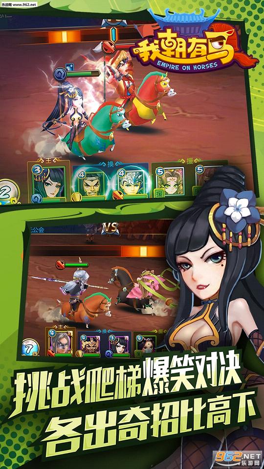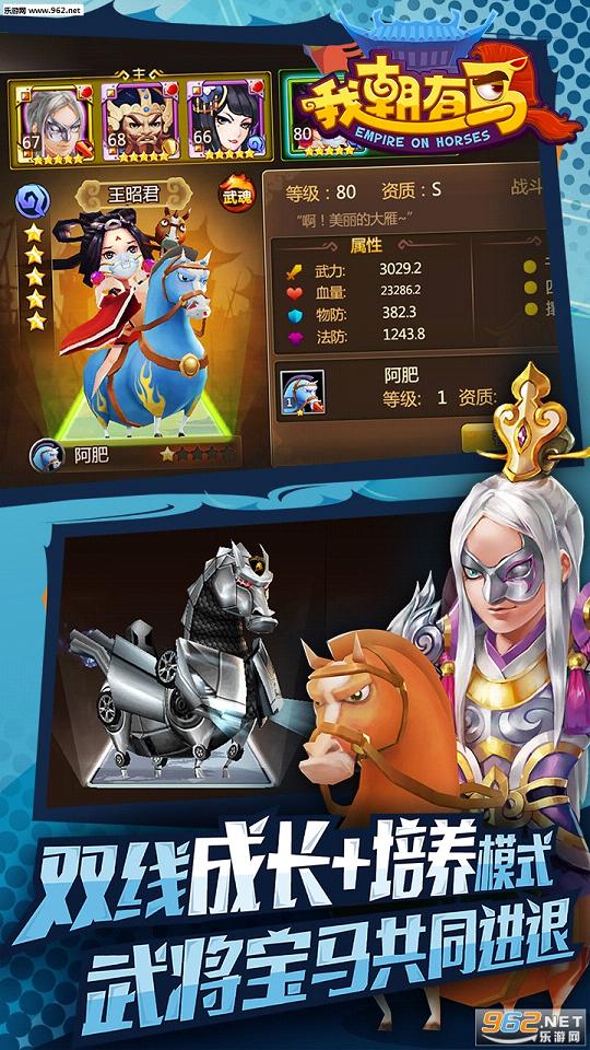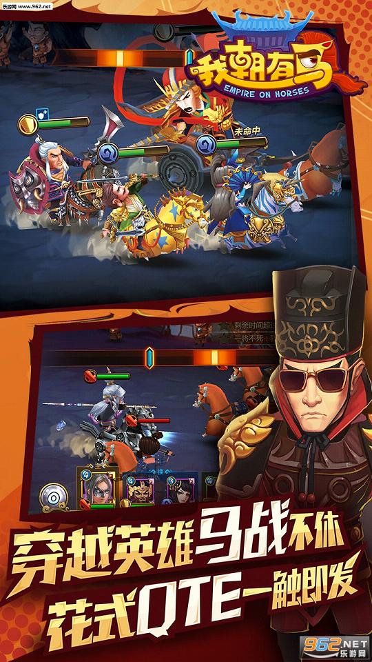 此外,在养成上,游戏虽 采用了玩家所熟知的类卡牌式,但却加入了独树一帜的“战马系统”,能带给玩家全新的卡牌体验。而游戏的 背景故事则始于“穿越”,中华各个朝代的历史名将因穿越来到三国,全新的“打天下”故事由此开始。 《我朝有马》的核心战斗采用了“战将骑马”对冲,并以独特的方式还原历史中骑兵对阵的战斗形式。而“马战QTE”则是游戏中的特色战斗,玩家通过使用武将的主动、被动、援护技能,可触发QTE特效。