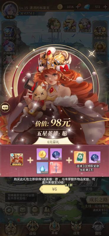 ★首充双倍返利,送5星英雄:愿,可直升英雄50级;