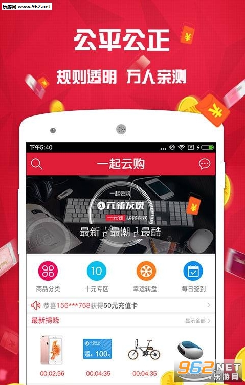 一起云购app是一款超好玩的新型购中奖应用软件,实现梦想,只需一元钱,一元钱就可能获得千万大礼包、iphone7、购物券、豪车、电脑等等,惊喜享不停、幸运大爆发,规则透明,万人亲测,放心大胆一起嗨翻天!感兴趣的伙伴赶快过来下载吧!