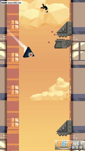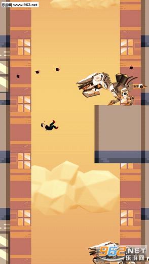 故事的主角是位身披红色斗篷,一身黑色装扮的中年大叔,当他从高楼跳下就开始了自己的勇者表演。游戏内玩家需要左右移动控制他躲避楼宇间的机器人或者是其他飘忽不定的干扰物,完成这项危险的挑战任务。