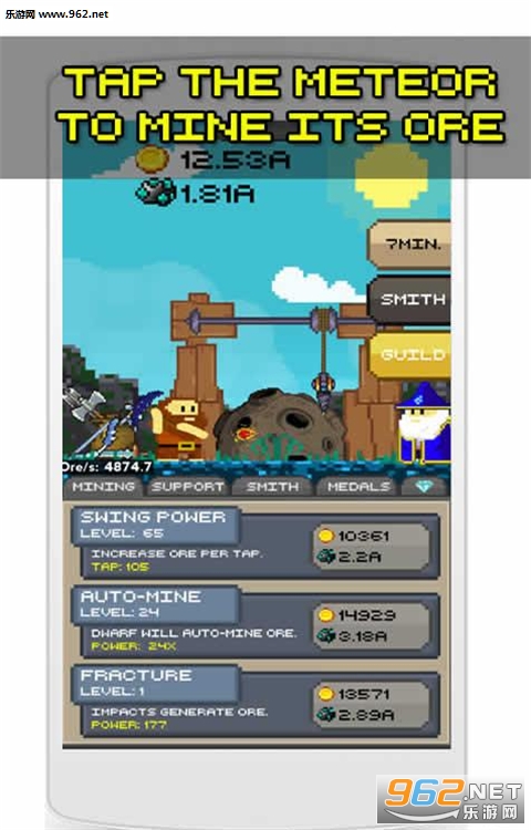 游戏采用可爱的像素画风,讲述一颗外星陨石掉落到地球上,玩家发现了这颗神秘的外星陨石并不断挖掘陨石上的神秘金属物质来致富的故事。